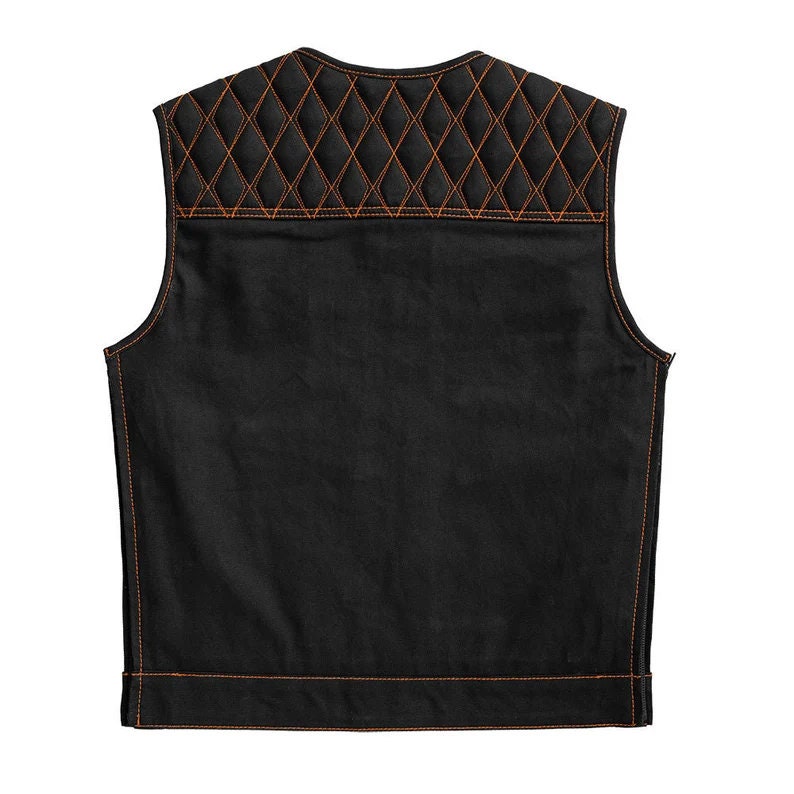 Tags: denim biker vest, Hunt Club, leather builder, diamond quilted, custom biker vest, paisley vest, rugged style, sophistication, craftsmanship, individuality, motorcycle fashion.