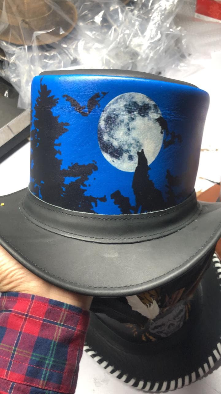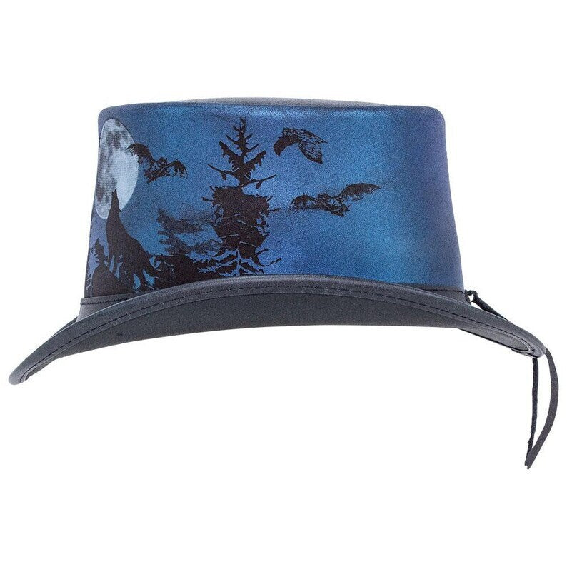 Introducing the Halloween Wolf Night Steampunk Black Leather Top Hat - a perfect accessory to elevate your gothic or steampunk style. This top hat features a unique design with a wolf howling at the moon on a spooky Halloween night.