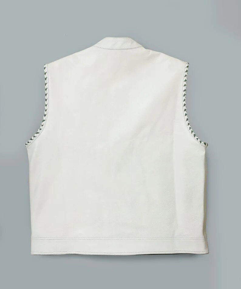 Hand Made White Hampton Leather Biker Club MC Green Paisley Arms Braided Motorcycle Rider Men's Vest