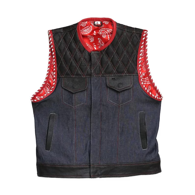 Tags: leather vest, diamond quilted, perforated leather, denim, motorcycle vest, braided, men's leather vest, biker, rider, club, rugged style, functionality, motorcycle fashion.