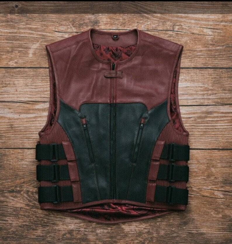 Leather Vest Mens Hunt Club Diamond Quilted Black & Maroon Leather Build Denim Style Rider Motorcycle Leather Vest Mens Vest