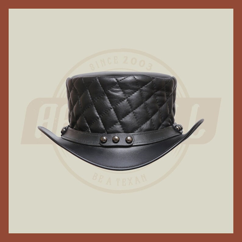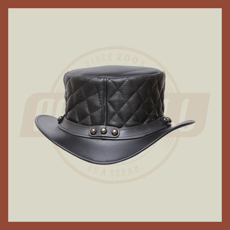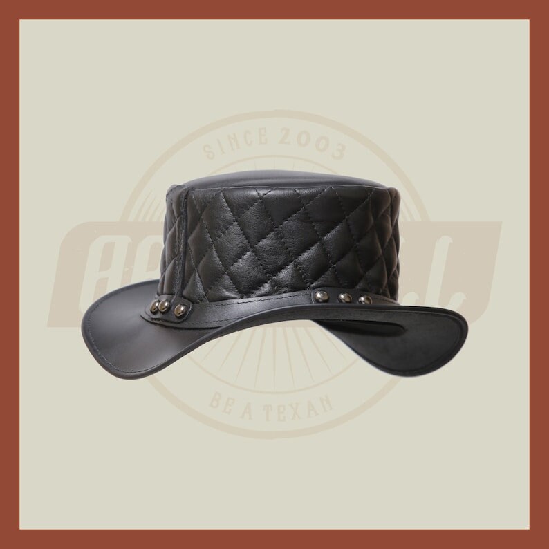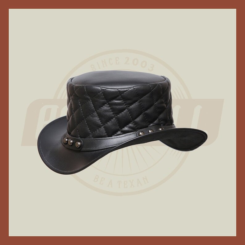 Tags: side bead band, leather hat, steampunk, biker, quilted design, versatile style, fashion-forward. Leather Top Hat, black leather Hat, Mens top Hats, Womens top Hats, Steampunk hat, Custom leather Hats, Vintage hats, Western leather hats, Cowboy hat, Handmade hat, Fashion hat, Gothic hat, Biker hat