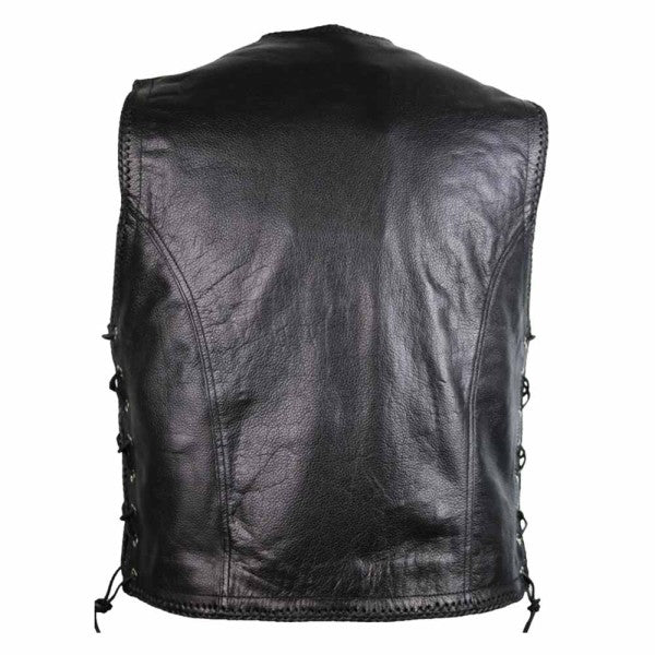 The vest is black and was processed with black leather cord. Also ideal for club logos and/or patches.