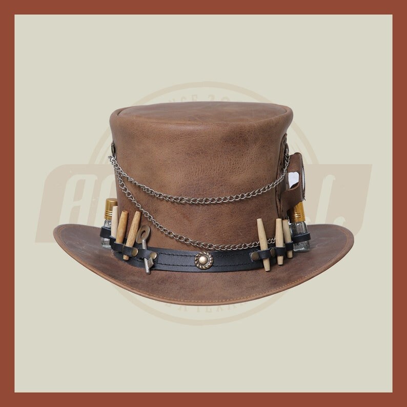 Crafted with high-quality leather in a striking combination of brown and black, this top hat exudes a timeless and distinguished appeal. The intricate details, reminiscent of the inner workings of a time machine, add a touch of mystery and fascination.