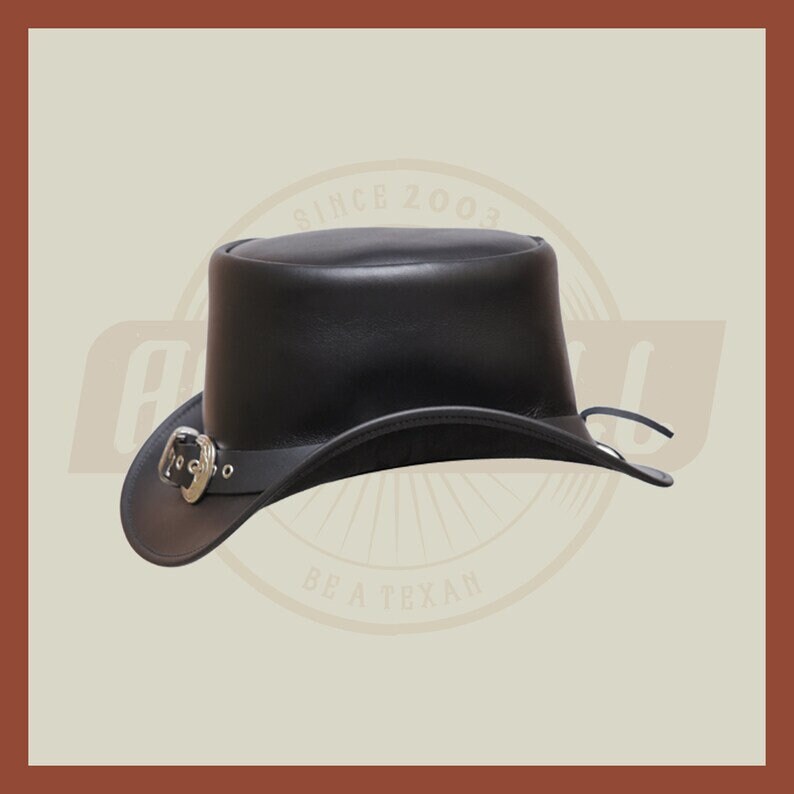 Embrace a fusion of Wild West charm and retro-futuristic allure with the Western Cowboy Buckle Band Style Steampunk Leather Top Hat. This captivating headwear combines the ruggedness of a cowboy aesthetic with the adventurous spirit of steampunk fashion.